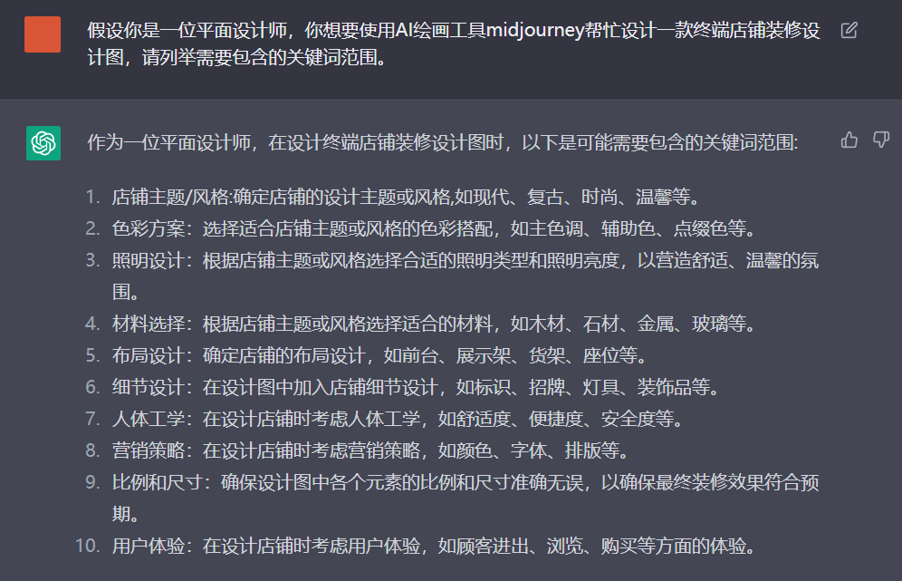 假设你是一位平面设计师,你想要使用AI绘画工具midjourney帮忙设计一款终端店铺装修设计图,请列举需要包含的关键词范围。