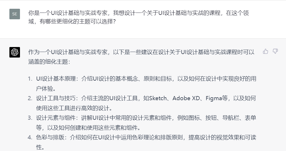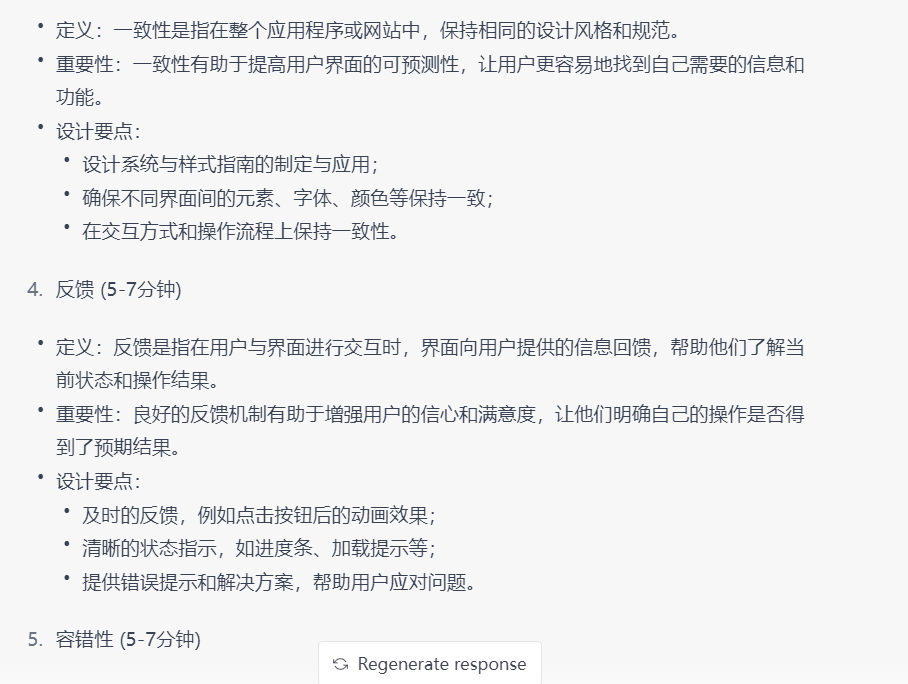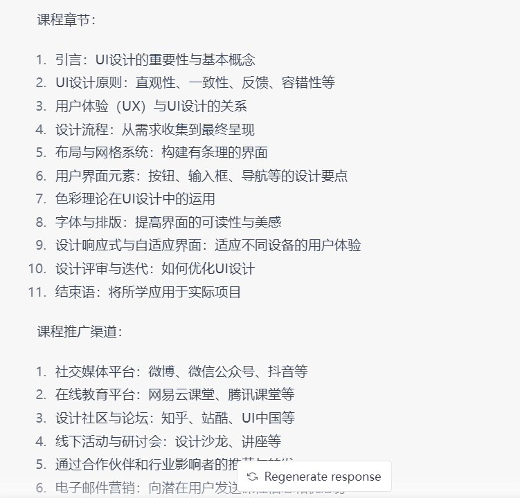 第四步:针对课程大纲里面的单独小节进行提问,让Chatgpt根据上面提问的回复,进行总结,最后生成对应主题的章节内容。